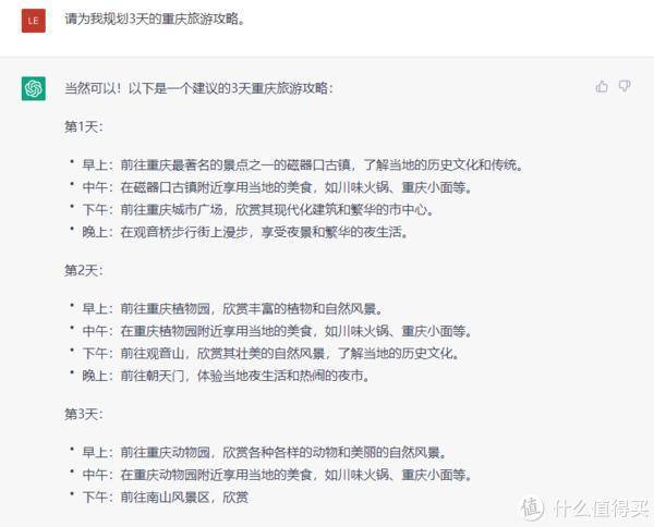 趁热打铁,让ChatGPT帮我规划了3天的重庆游攻略。没想到它给我一个清晰可操作的路径。