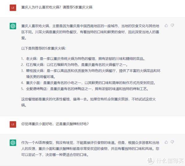 ChatGPT给我推荐重庆火锅的时候,不小心暴露了一个新问题。这次更夸张了。推荐的5家火锅店,没有一家是真正的火锅,何况火锅。无关的重庆小面和全聚德烤鸭。这也说明ChatGPT的人工智能有一定的局限性。简而言之,它知道一些,但不多。