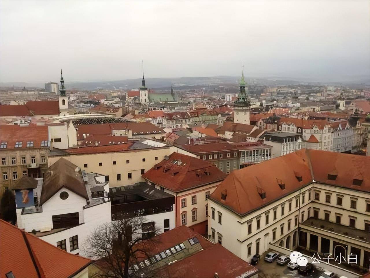 在教堂的塔顶俯瞰布尔诺全城,工业化城市和交通枢纽尽显其中。