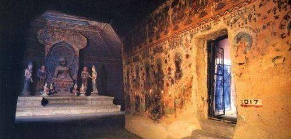 1924年美国的华尔纳用75两白银,用特制胶布粘走26块精美壁画,盗走彩塑、半跪菩萨各一尊,经卷2件。