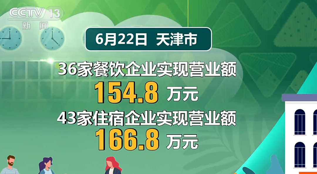 据天津市商务部门统计,6月22日,天津市36家餐饮企业实现营业额154.8万元,同比增长1.3倍;43家住宿企业实现营业额166.8万元,同比增长55.7%。