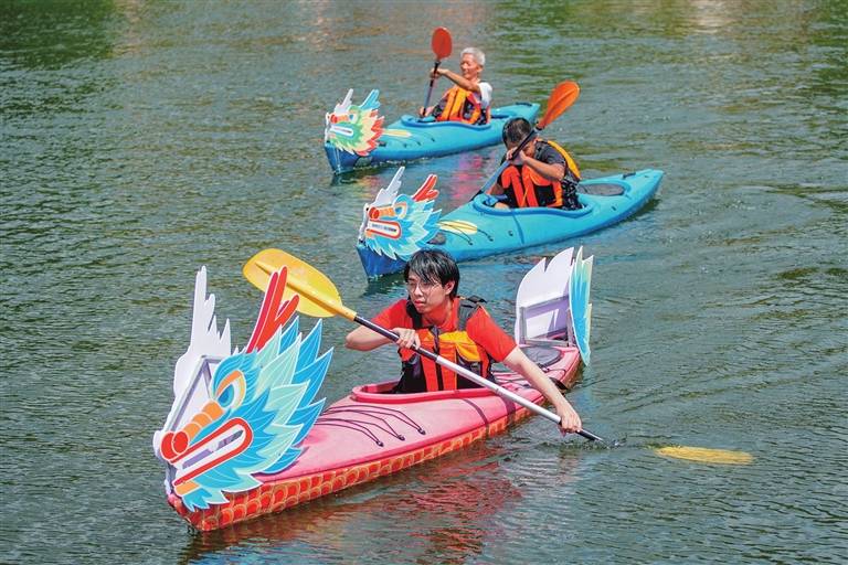 “加油!加油!”昨日上午,巴伐利亚庄园天鹅湖热闹非凡,一场别开生面的趣味龙舟接力赛正在激烈进行,近20支由各地游客组成的家庭小队上演了一场水上“速度与激情”。湖面上,龙舟队伍你追我赶;湖边,加油声、助威声、呐喊声交织在一起,点燃夏季激情,天鹅湖畔一片欢腾。在庄园的另一边,“包菖蒲花束”活动也正有序进行着。“这是我们提前一天到户外山林中摘取的新鲜芦苇叶等制作材料。”据活动负责人介绍,在门边挂艾草、菖蒲是端午节传统习俗,有祈福全家、驱邪、祈福和庇护之意。在老师的指导下,游客认真地将各种花材包成自己喜欢的花束,为家人祈福。据了解,端午假期,巴伐利亚庄园除了举行趣味龙舟赛和“包菖蒲花束”活动外,还有端午游园会、啤酒嘉年华、戏水“粽”头戏、“粽”享夜游等系列活动。端午假期首日,巴伐利亚庄园迎来了大量游客,接待人数达1.1万人次。