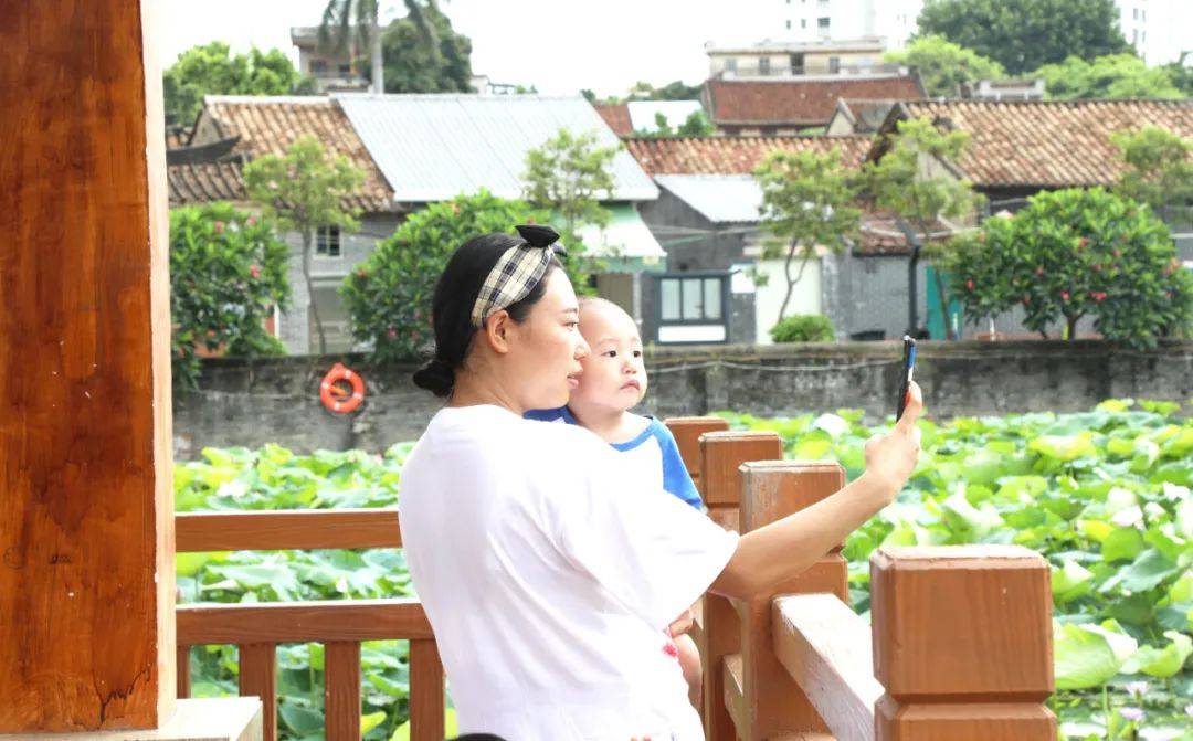 满塘盛开的荷花吸引了众多市民前来游玩,他们闲庭信步,观赏美景,一个个乐在其中。 还有不少摄影爱好者,手持“长枪短炮”前来取景,定格下荷花最美芳容。