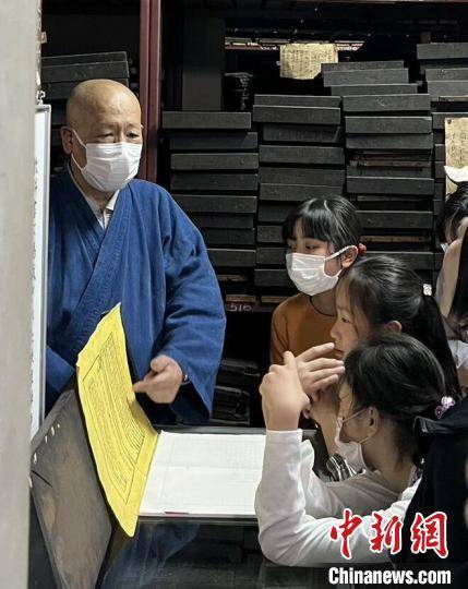 黄檗宗法师向日本华人亲子研学团孩子讲解印刷、稿纸等黄檗文化内容。 张艳 摄
