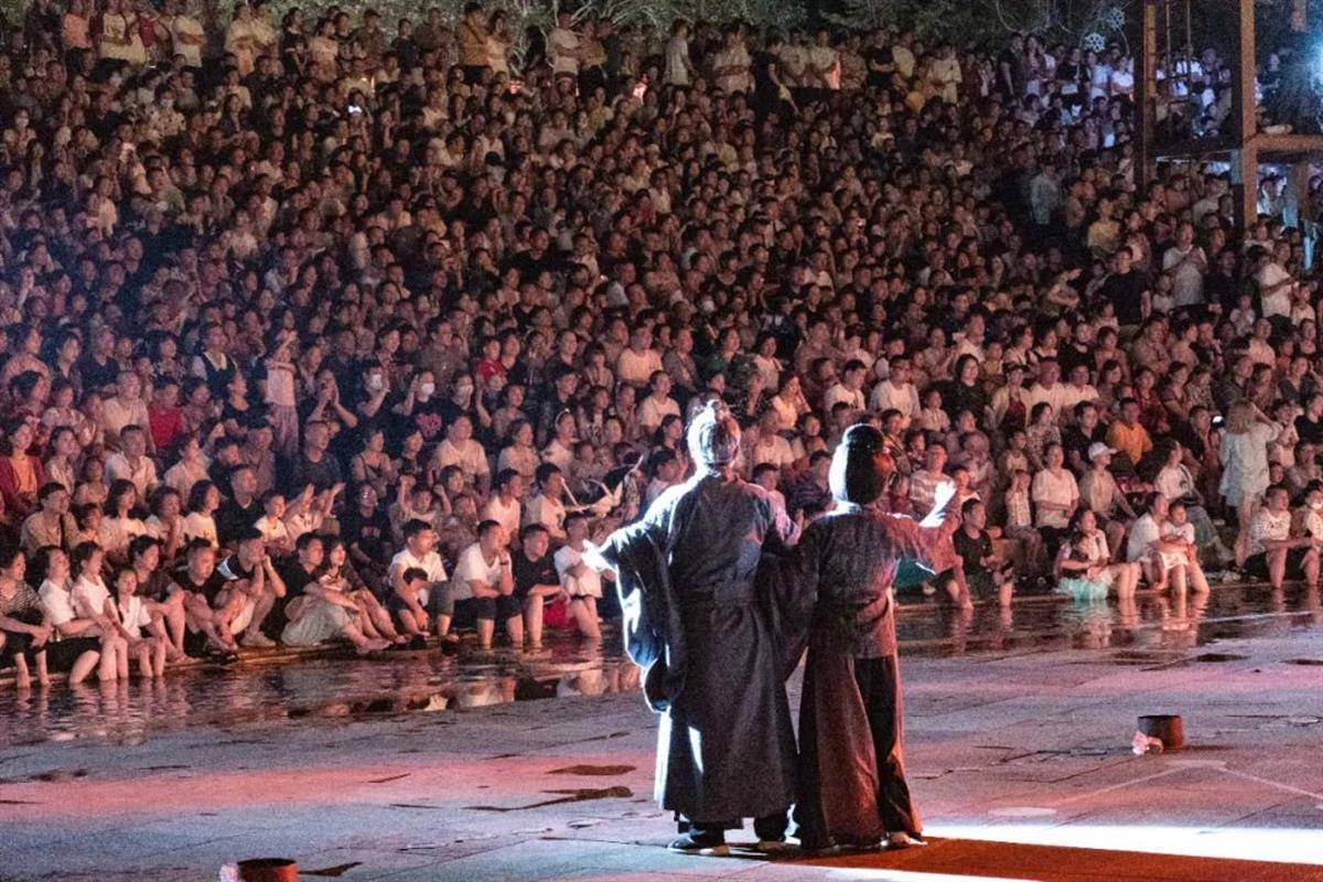 下午四点半,木兰奇妙广场的傣族泼水狂欢正式开始。夜幕降临,木兰不夜城灯光点亮,许多游客在美轮美奂的商业街打卡拍照,在东西市感受北魏盛世的繁华,品尝地道的美食小吃。晚上八点半,全新实景演出《木兰传奇》正式上演,现场观演人数达到峰值,观众区座无虚席,场面十分火爆。