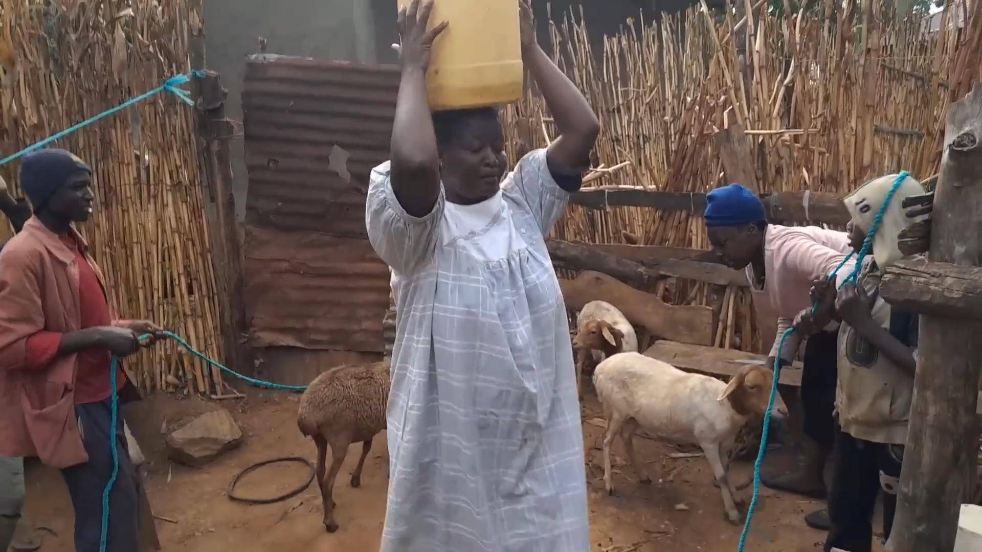 这个家庭来自肯尼亚,穿着白色裙子的是金丽。每天从起床开始,金丽就忙个不停。由于没有自来水供应,她需要亲自到旁边的井里挑水回家。并非每户人家都拥有井,一些地区地下水资源有限,而且钻井需要很大的费用,因此他们通常与家族或邻居共同分享同一口井。