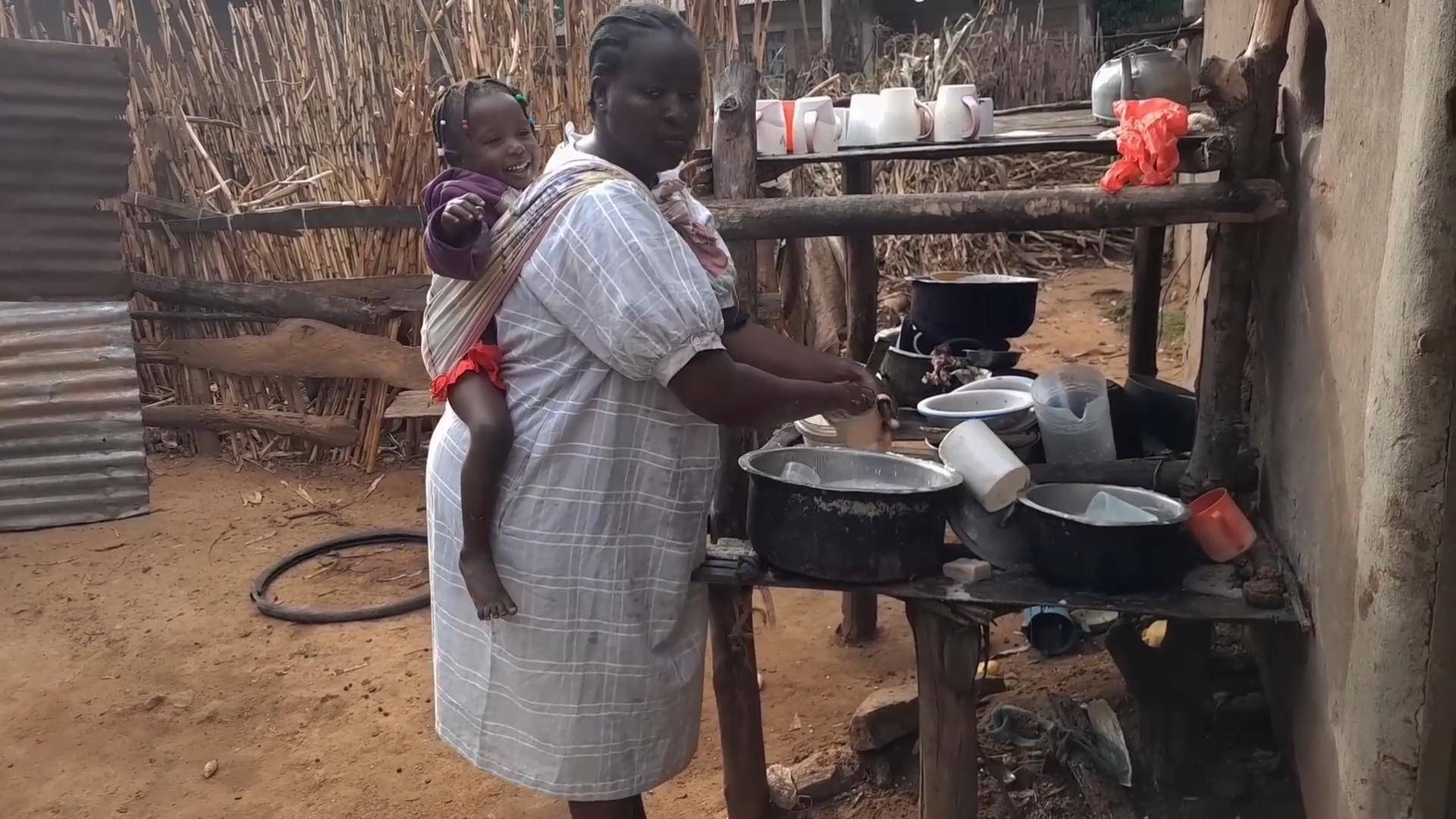 为了确保孩子的安全,她只能将小女儿背在金丽身上。虽然背着孩子做事不太方便,但幸运的是家里的男孩和女孩都乐意帮忙。男孩帮忙洗碗,女孩帮忙扫地。