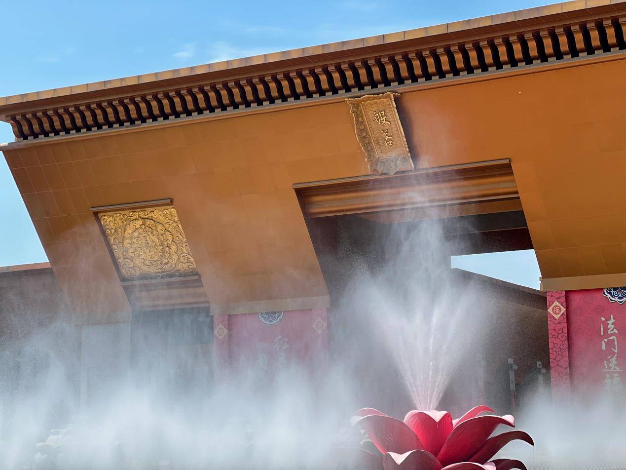 站在山门广场,看到佛光二字,我们瞬间融入到了庄严肃穆的文化氛围中,只觉得头脑清爽,内心平静。进入景区,两边水气袅袅,从水中大大的莲花中心腾腾飘散,仿佛置身仙境。女儿忍不住拍了好些照片,才跟上我们的脚步。