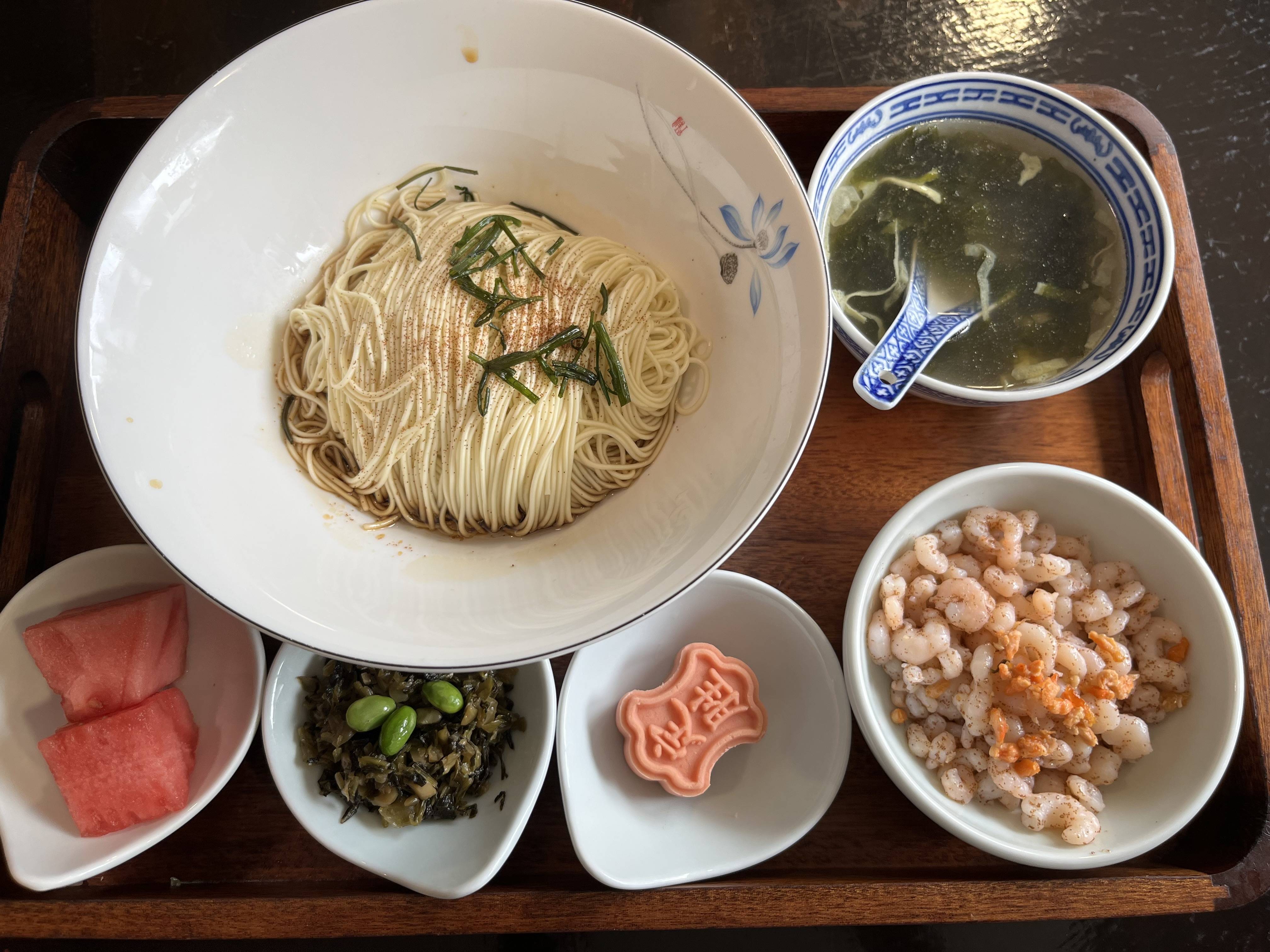《太湖备考》中云:“白虾,色白而壳软薄,梅雨后有籽有膏更美。”苏州“同德兴”面馆号称是苏州最地道的面馆,其出品的三虾面广获好评。面端上桌,三虾浇头“过桥”,服务人员为顾客一对一服务,快速将面和浇头拌匀,入口有虾籽沙沙的质感,味极鲜。当然,价亦不菲,此是江南一带饕餮客们每年一度的味蕾盛宴。其外,杭椒肥肠、五香小肉、罗汉净素等浇头,味道可圈可点;一碗物美价廉的葱油开洋拌面,竟是意料之外的好吃,夏令食之尤美。