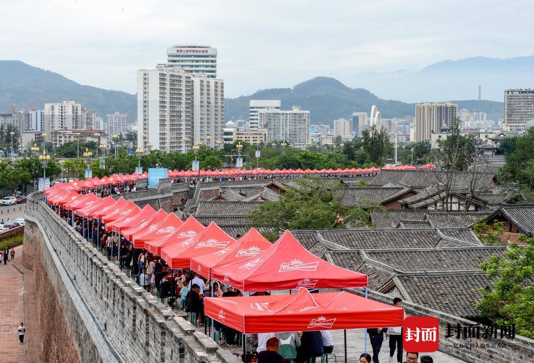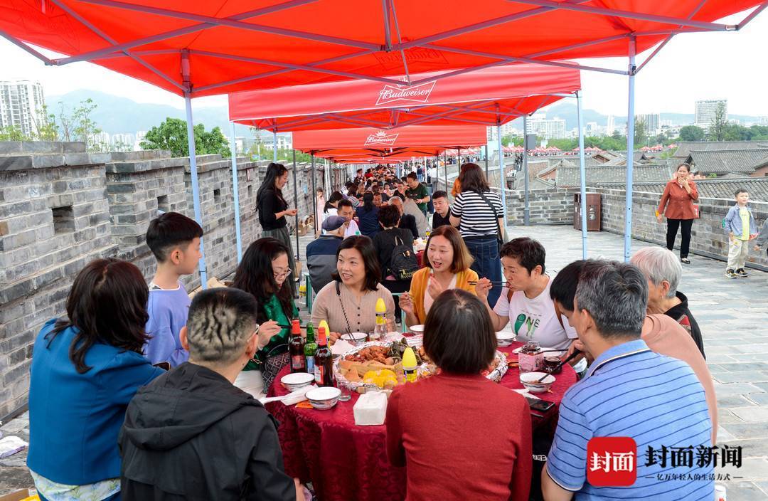 除了巡游表演,当天下午,建昌古城还举行了“千人药膳宴”。100多桌药膳在古城城楼上摆成长龙,上千人一同品尝了极具特色“药根宴”,共度端午佳节。