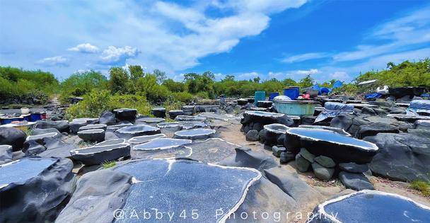 总数达6800多槽,蔚为壮观,平时在石槽中注入经过滤后的海水,海水涨潮时海水也会自动漫入这些石槽,让烈日曝晒成盐。