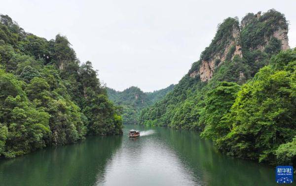 6月23日,游客在湖南张家界宝峰湖景区乘船游览(无人机照片)。