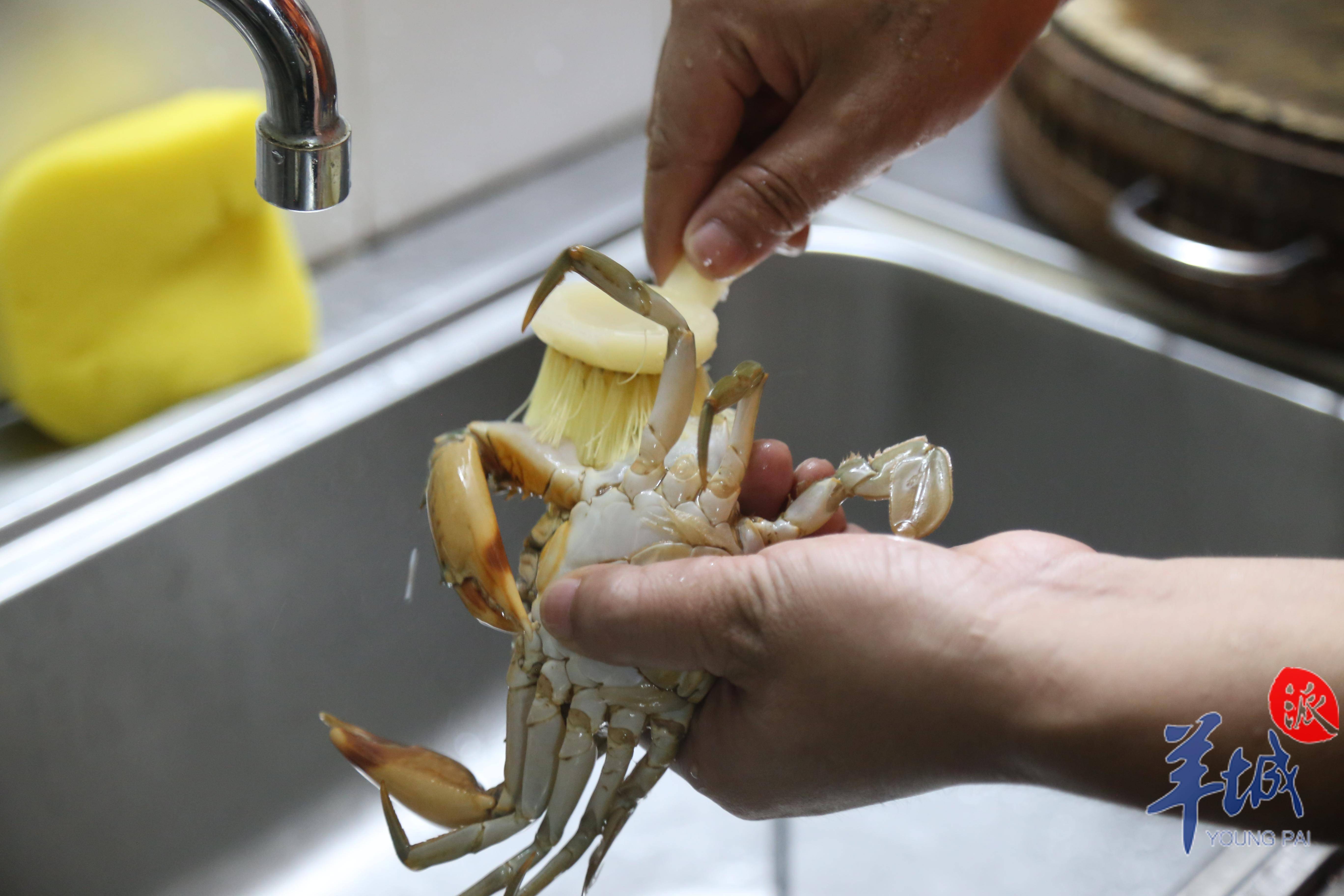 10分钟后捞起奄仔蟹,仔细用刷子把蟹刷洗,需注意蟹腿与蟹身之间的两个侧面,全部要刷洗干净。