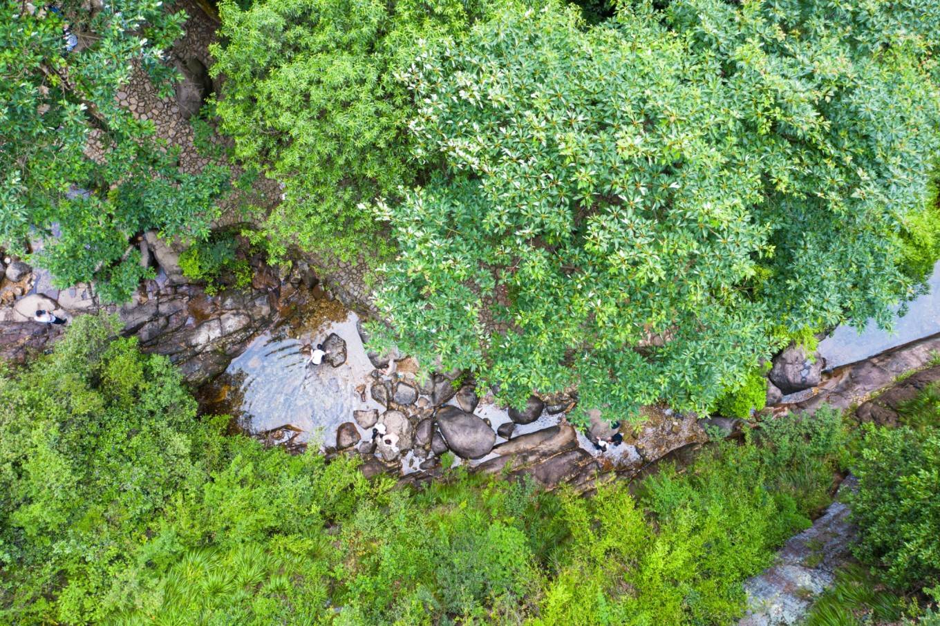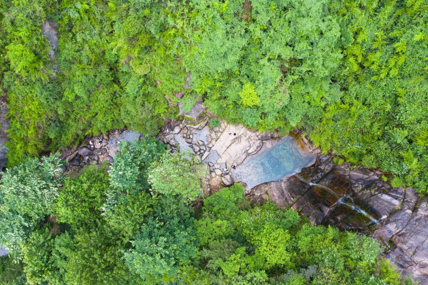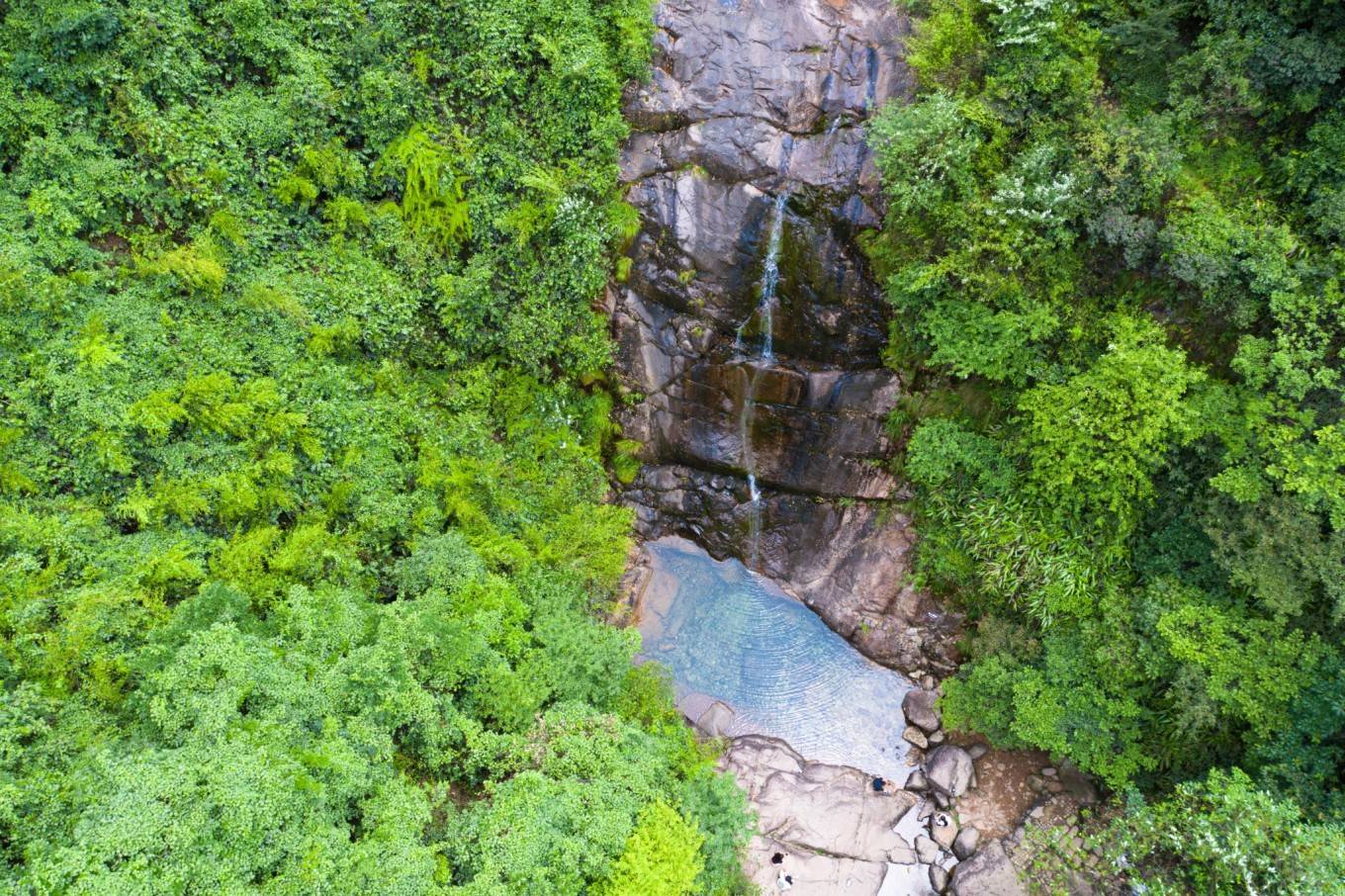 随着风吹水溅,水珠如雨纷纷洒落,营造出一种神秘的氛围。水流汇聚成一个个小漩涡,然后又转瞬消失在巨大的水幕后,落入清澈见底的潭水中。站在瀑布下面,仿佛被掩埋在一处清凉的世外桃源,听着水声潺潺,感受到一股磅礴的能量和绿色的生机。