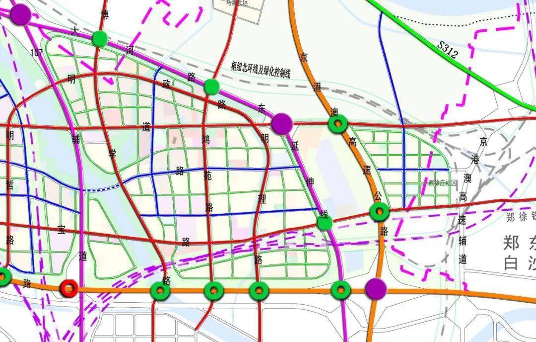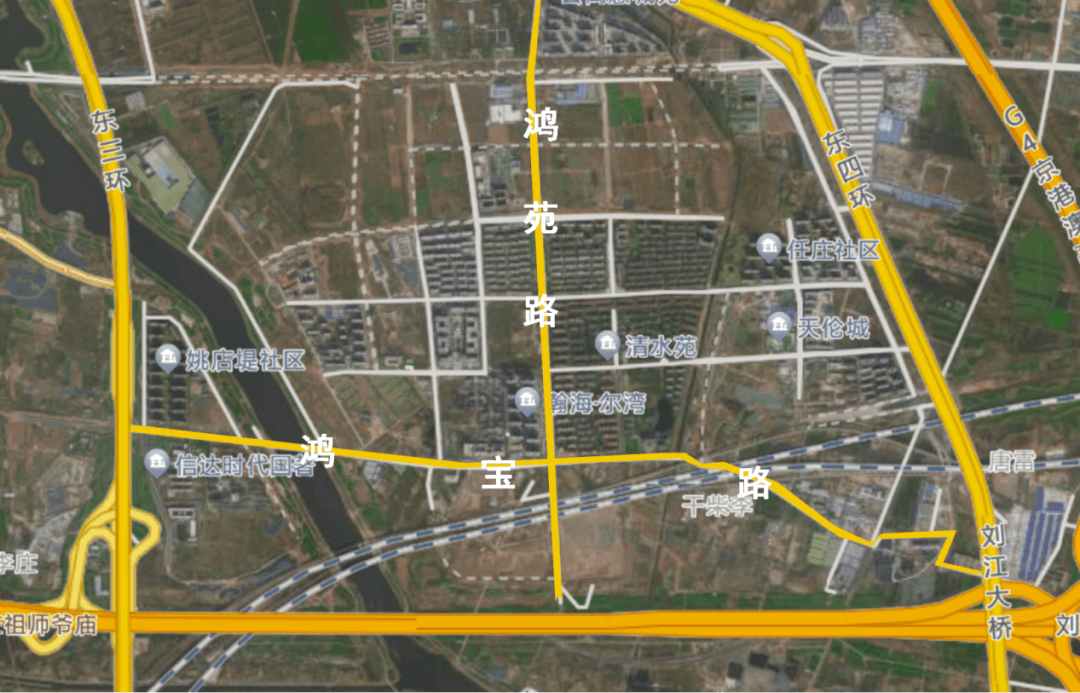 规划里面,鸿园的路网还是很规整的,三纵三横,西南与连霍交汇处还有个高速上桥口。