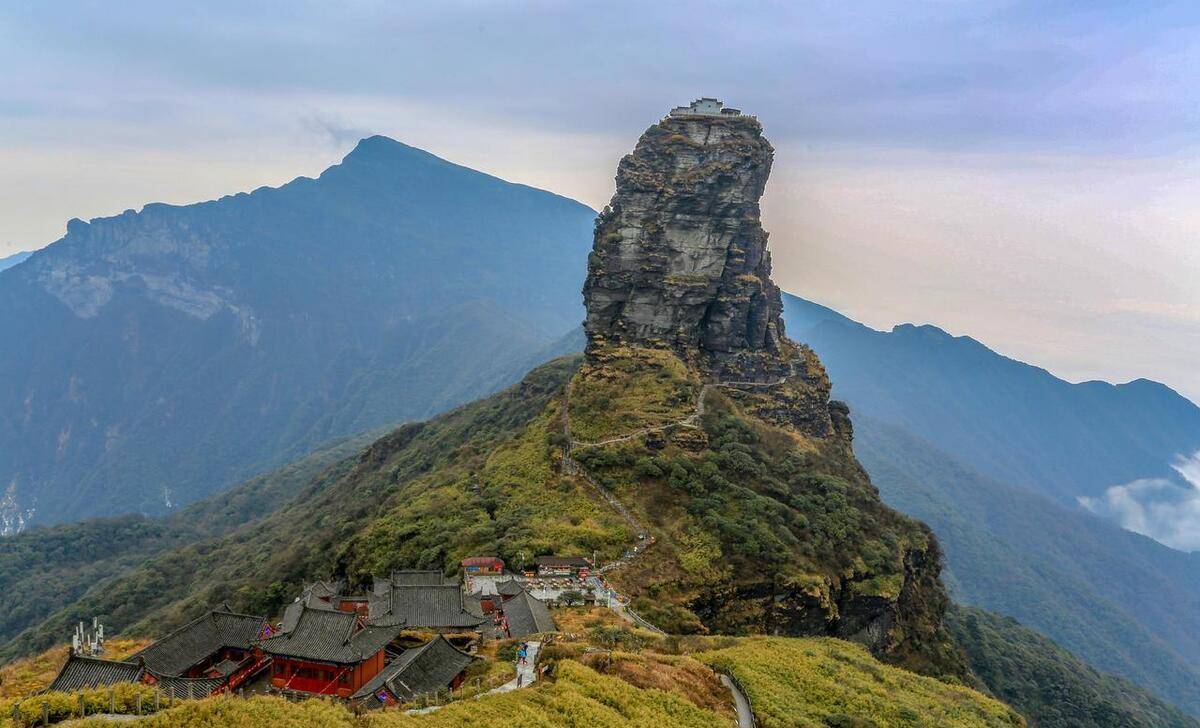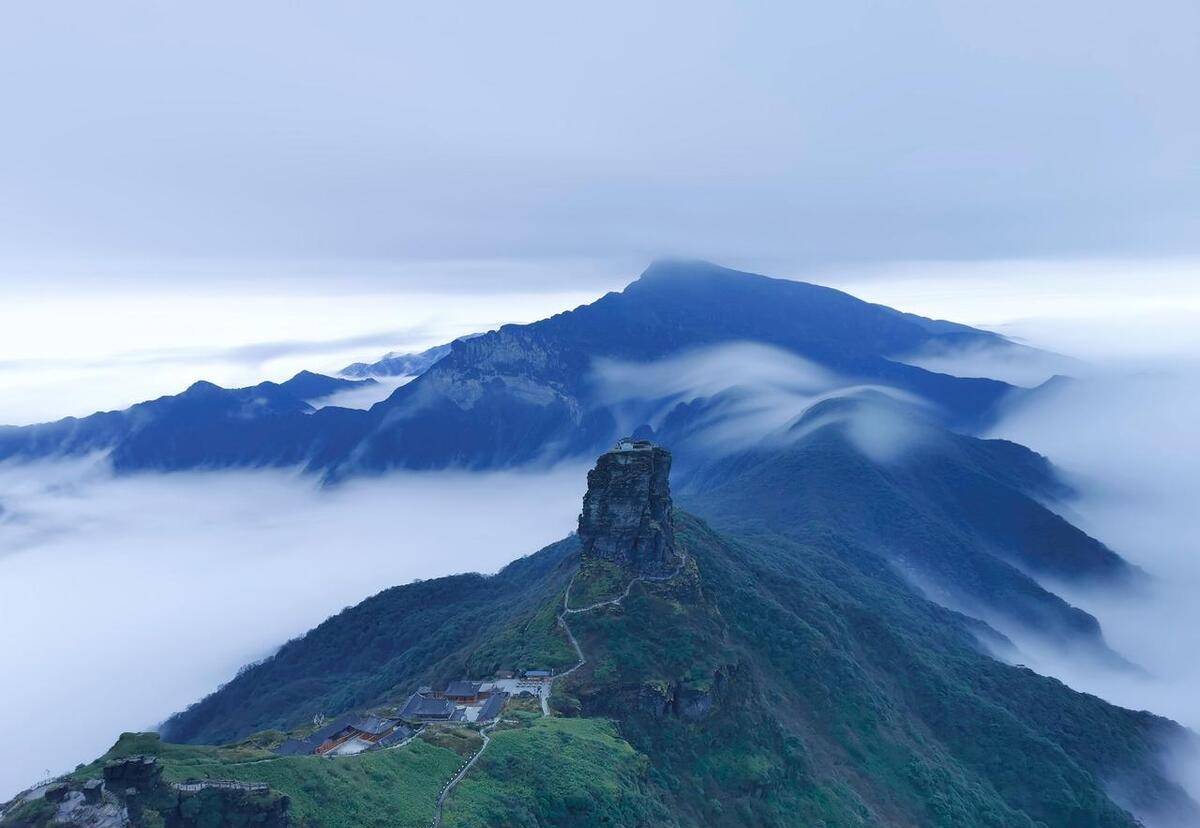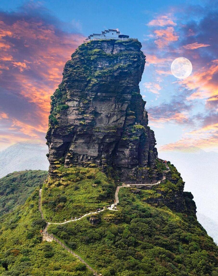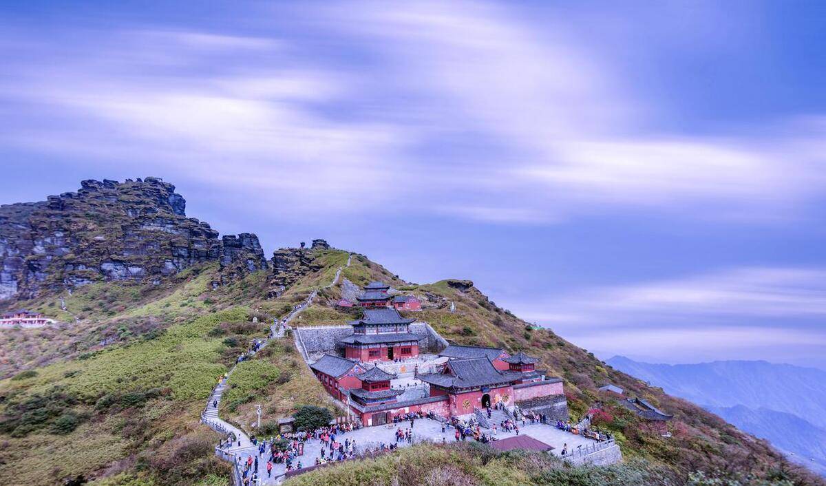 梵净山,位于贵州省铜仁市江口县,是中国五大佛教名山之一,其余四座为:安徽九华山、山西五台山、浙江普陀山、四川峨眉山。梵净山是武陵山脉主峰,森林覆盖率为95%,景色优美。登梵净山有两条路线:东线和西线,东线索道上山,西线徒步爬山。西线登山道的休息凉亭两侧,贴心的设计了动植物的科普知识长廊,将梵净山特有的动物、植物的特点和生活习性也都做了比较详细的介绍,感兴趣的可以看看。爬到陡峭处,在峭壁外侧有铁索、水泥柱子建成的护栏,攀登小路的内侧山石壁上挂着很多铁链供攀登者使用。