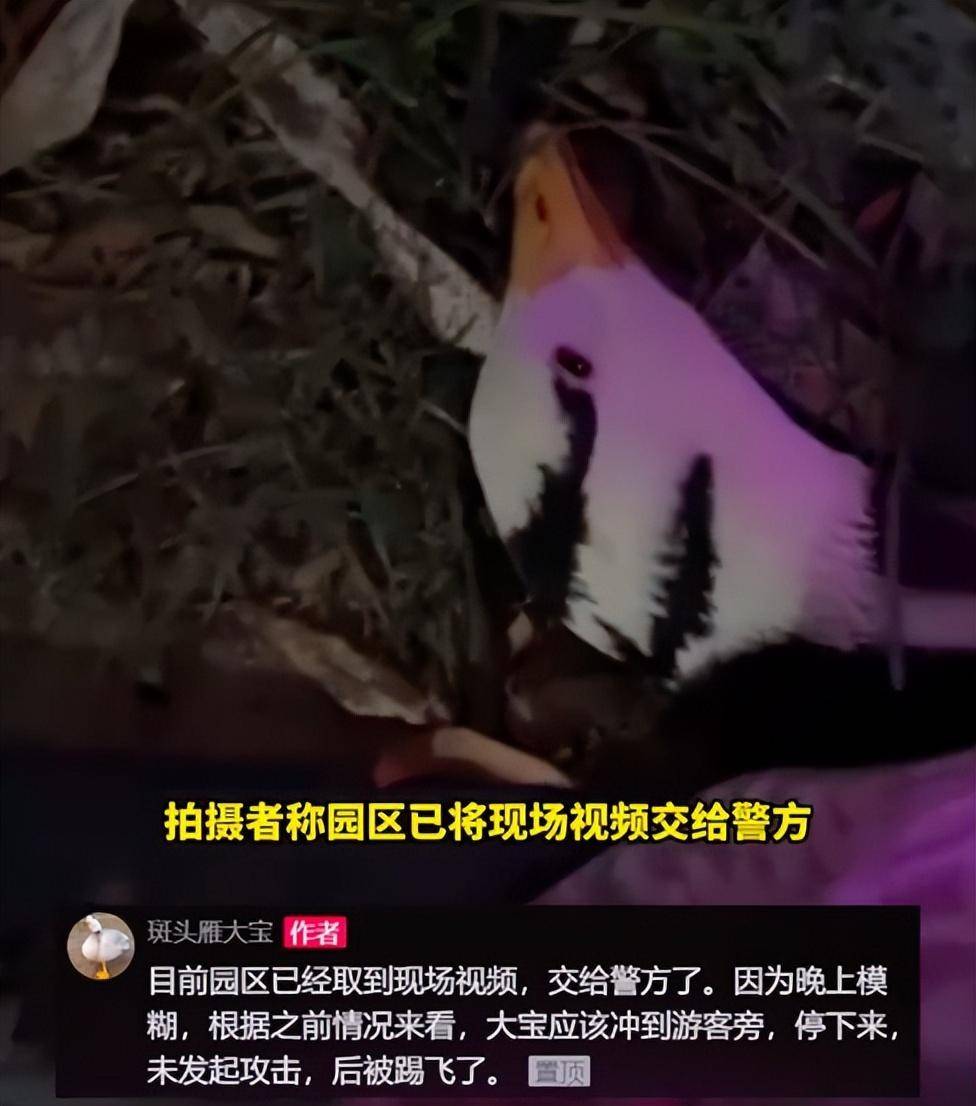 此外,发布者还表示,目前园区已经取到现场视频,已经交给警方了。因为晚上模糊,根据之前的情况来看,大宝应该是冲到游客身旁停下来,未攻击,但后来被踢飞了。