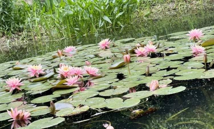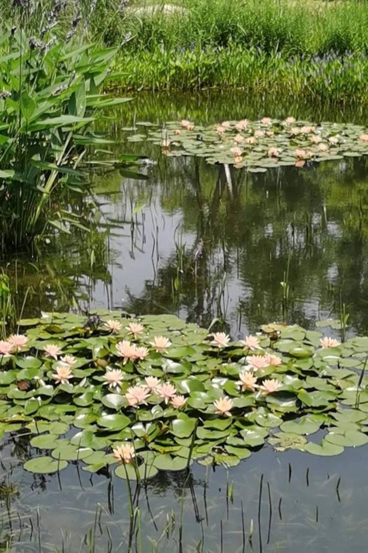 在荷塘驿站、雨水花园附近的水体内,已经绽放的睡莲份外美丽,微风拂动,水面荡起阵阵涟漪,花影照水中宛如美人凌波,在夏日中尽展曼妙之姿。河里的鱼儿成群结队,你追我赶,好一幅鱼戏莲叶图。