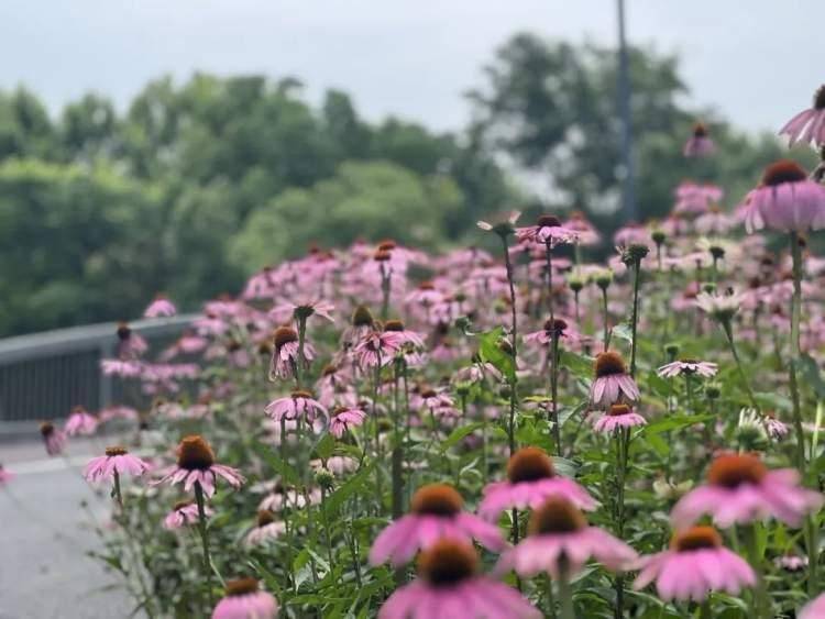 盛夏如约而至,成片开放的松果菊组成了一个个小花境,让绿道里盛满活力和色彩,明丽的粉色在艳阳下,仿佛游走于时空中的彩色精灵。