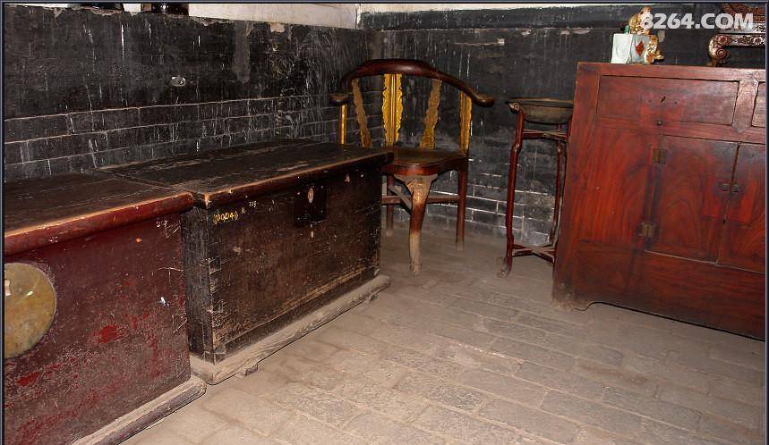 镖箱,本身重有七、八十斤,采用的是榆木制作,上面有一个锁,采用了当时最先进的防盗暗锁,只有大掌拒和二掌拒的两把钥匙合并起来才能打开它,起到一个防贪污之用。屋角那种角椅是女人们坐的。