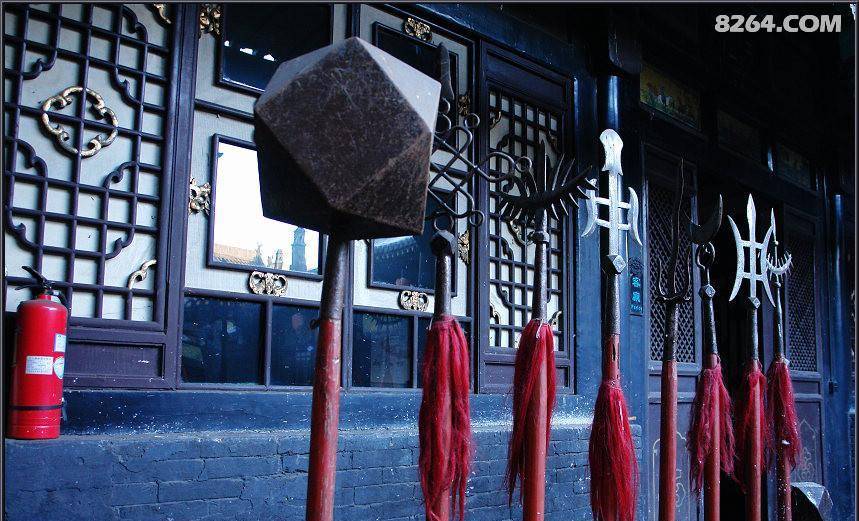 镖局从狭义的角度来讲就是为一些商家、个人提供安全保障的专门机构。镖局是以押运一些现银或贵重货物收取一定费用的旧式保险业,到清朝中叶平遥票号兴起后,平遥商业也开始步入黄金时代,票号业、商业的繁荣,必然带来了另一业的繁荣,这就是保镖业的繁荣,您现在所处的是平遥县内唯一的一家镖局旧址“同兴公镖局”,在这首先看一下这个“镖”字,“镖”在以前是习武人用的一种兵器,然而保镖业都是些习武之人,他们经常会使用这种所谓的“镖”,久而久之,就把这种行业称为“镖局”。有了票号以后,我们觉着这样解释更为形象,咱们拆开来看一下,“金”字旁代表当时候的十八般金属兵器,“票”字代表票号里的钱,合起来就是用武力押送银两,用现代的话来讲是用武力来保障钱的安全(性质跟现在的保安公司一样)。