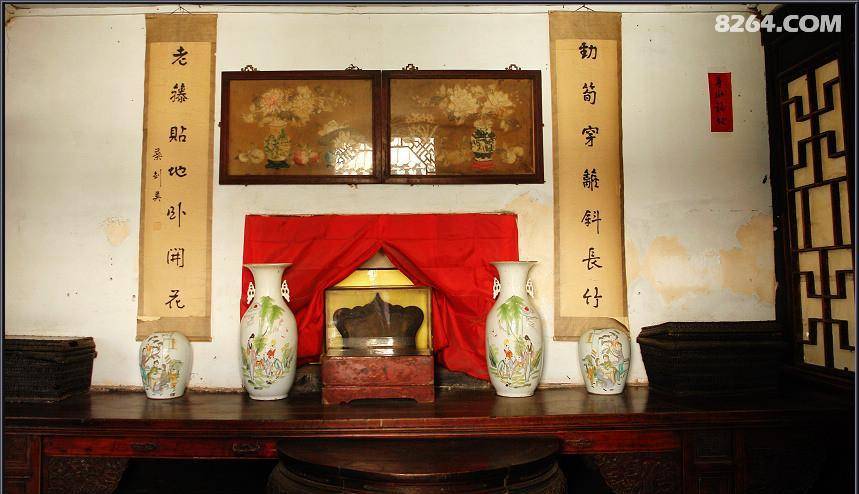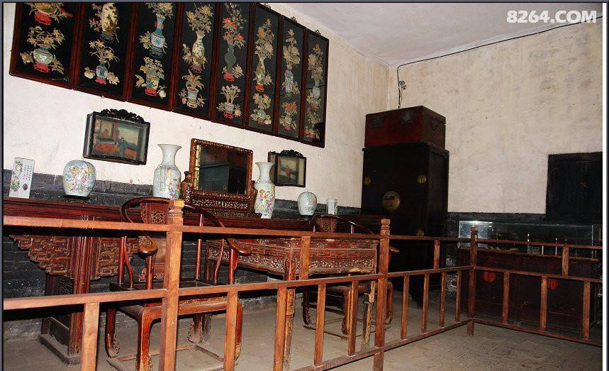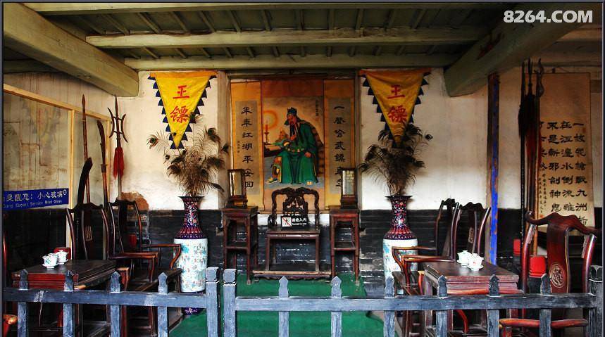 正厅是当时接待一些持有大宗业务的客户所用的,相当于现在的贵宾室。正中的这把椅子,一般的女士是不可以坐的,因为它两边有扶手,一般的男士也是不可以坐的,它曾经被江湖人称为“娇椅”只有江湖老大才可以上坐。像后面挂有一幅画与一幅对联,画供奉的是关公,一般习武之人讲究忠义二字,而这幅对联是“一声哈武镖车走,半年江湖平安回”,很容易明白当时走镖挺不容易的,来回得半年才能回来,而上联中的“哈武”是一个名词,当时候走镖时需要喊镖,喊镖一是为了宣传,二是为了与当地的武林人士打好关系,当时候江湖上还流传着这样一句不成文的规矩“镖不喊沧”,而王正清在一次走镖途中路过河北沧州,有一个小伙不懂江湖规矩就喊了一声镖,引起了一场武林纷争,王正清在大获全胜之后“镖不喊沧”的故事,从此流传了下来。