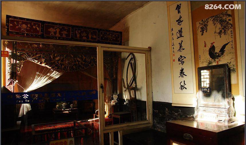 总镖头的卧室,睡的是土炕。墙上有两张美女图,原来那时的美女是这样子的,最大的特点是那小小的三寸金莲。当时和现在的审美观念不一样,不看外貌,只看脚,脚越小越高贵,并且当时等级地位特别严格,把这种画挂在家里不但有装饰作用,而且可以显示家族的荣耀和富贵。