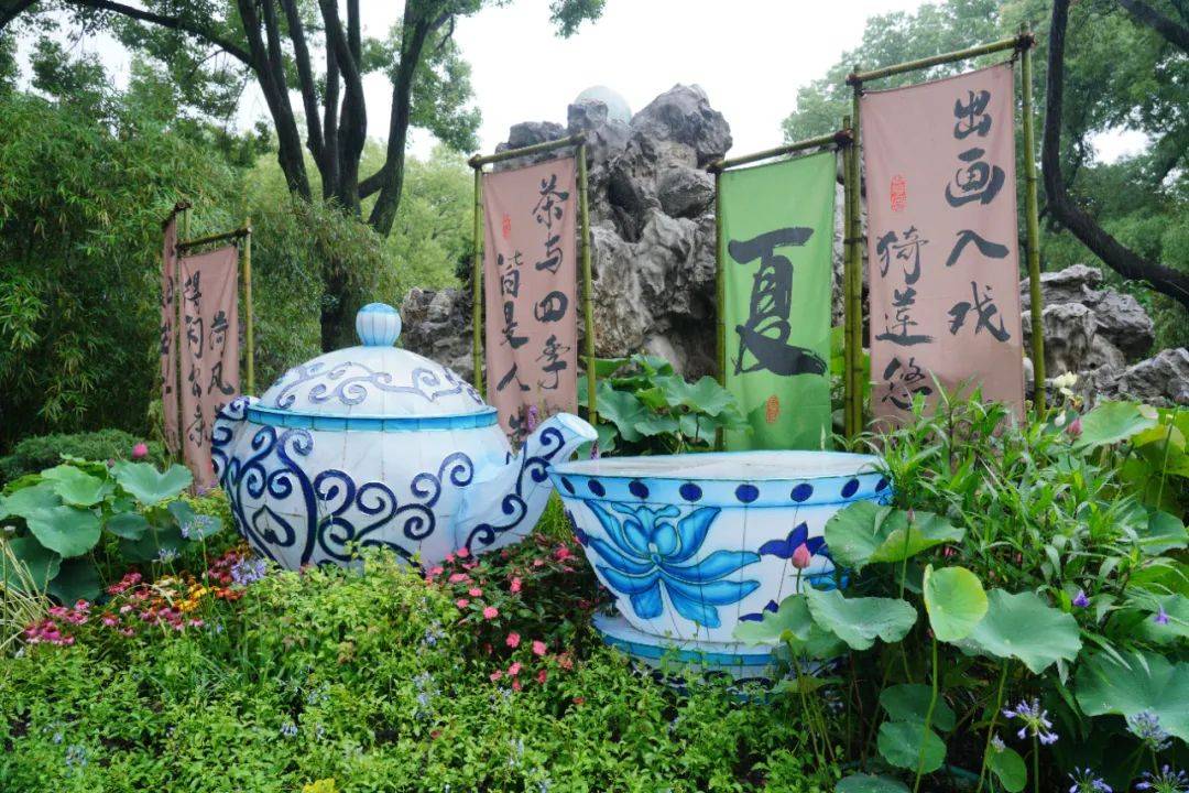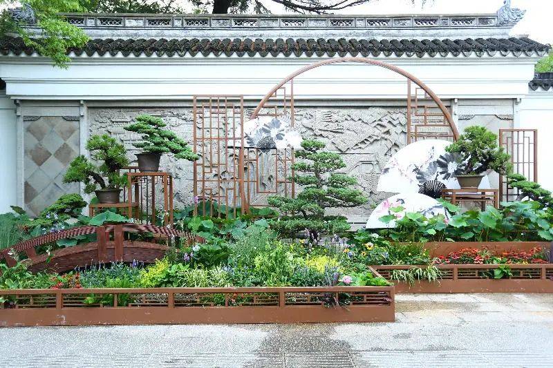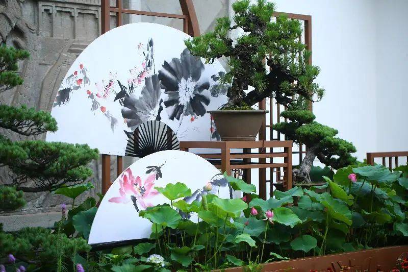 本次花展中,古猗园将竹编、书法、画扇等非遗元素巧妙地融入其中,展现出独有的古典园林艺术特色。