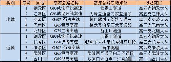 重庆交巡警微信公众号消息,返城易堵时段主要集中在6月24日15时至19时。期间,除上述易堵收费站外,G65包茂武隆西互通至白马互通段、接龙互通至石龙互通段,G93成渝环线云雾山隧道,G75兰海西山坪隧道等高速公路主线及隧道也将迎来大流量集中出行,详见下表: