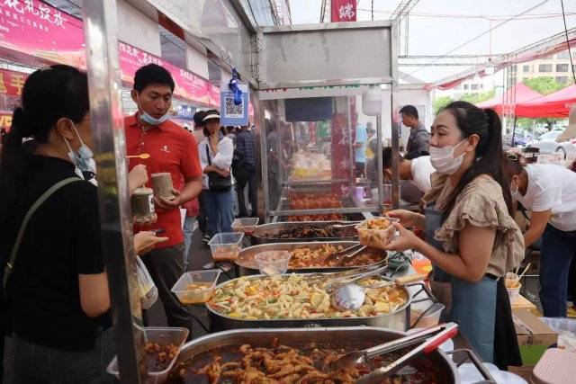 在美食一条街上,记者看到,无论是极具本土特色的金鸡烤乳鸽,还是来自大西北的肉夹馍,以及来自新疆喷香诱人的烤羊肉串等,吃的、喝的、大菜小吃一应俱全,没走完一条街就能让宾客享受到不同的美食体验。