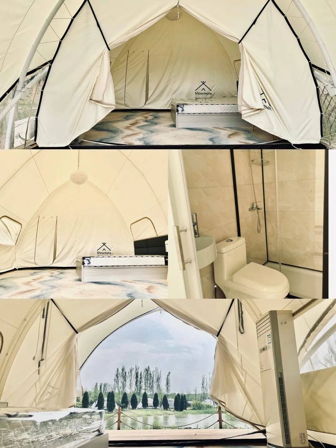 星空露营区的帐篷都是半球形的,抬头就能看见星空。金字塔区的帐篷形似金字塔,也有点像蒙古包,颜值高,很适合晒圈,也容易出片。