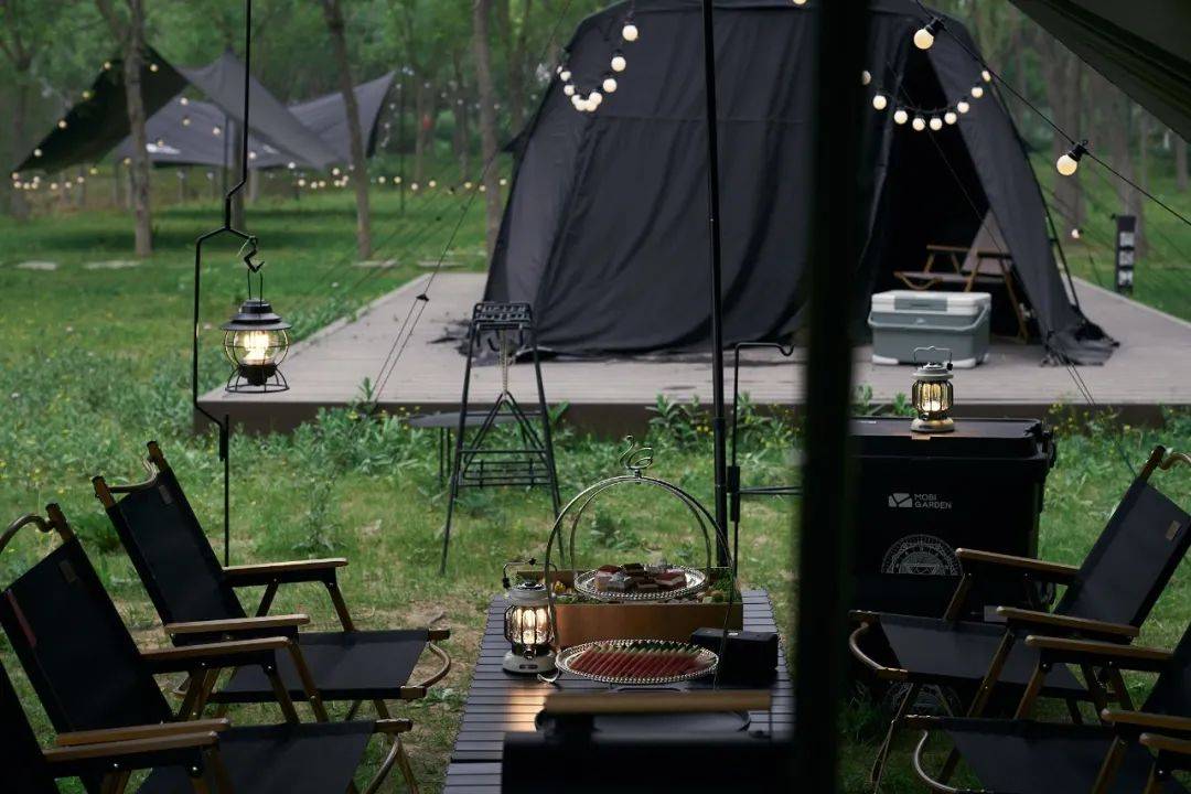 黑化风区用黑色系全套露营用具搭配星光烁烁的小灯泡,“营造了一个仿佛置身于萤火虫点缀的暗黑森林里,皎洁的月光在云雾拨开后延展开来,风在行走,树叶在私语,白日的忧虑在这一刻早已消散。”“暗黑”一词可以包含了羞涩的、静谧的表达,而这样的“暗黑”也是一种美,一种去体验自然不一样的美。