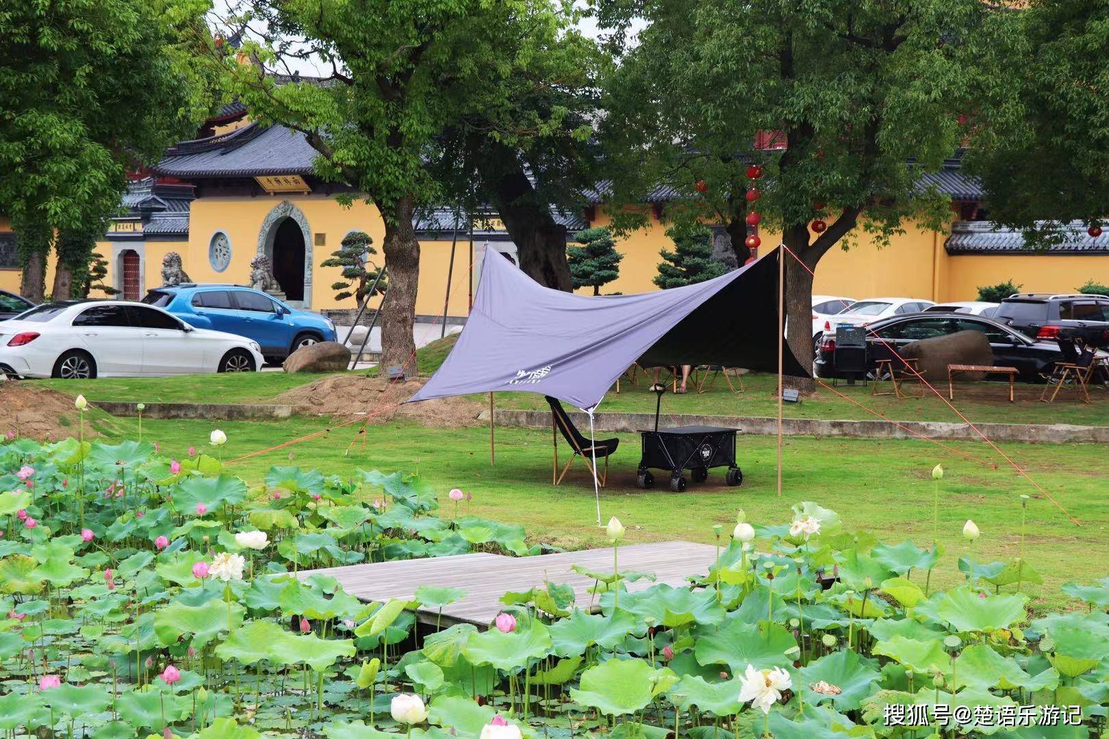 前往寺院的路边有一个荷塘,面积不是很大,充其量算是一个小池,却小而不俗,靠着美丽的颜值成功出圈,成为炙手可热的网红打卡地,前来游玩、消费、露营的人络绎不绝。