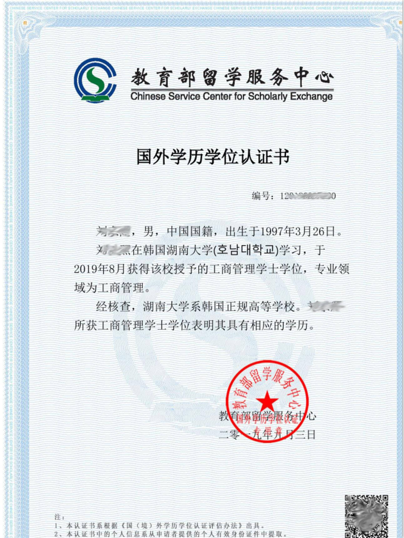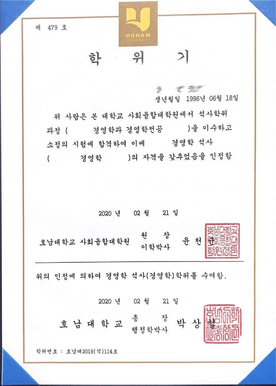参加该项目的学生通过3年时间在国内委托培养院校获得相关专业的课程成绩以及语音课程的学习,韩国湖南大学认可学分,然后到韩国湖南大学留学1年完成本科课程/3年完成研究生课程,取得由韩国湖南大学颁发的本科学位证书/研究生学位证书,经中国教育部留学服务中心认证,国家承认学历,证书在中国教育部留学网可查询,可参加公务员考试,回国后享受海归待遇。