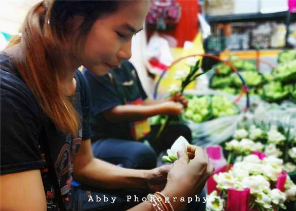 曼谷素有“佛庙之都”之誉,泰国神一般用荷花、菊花、阿勃勒花等花拜祭。在这个佛教国度,夏天花市里到处可以看到荷花的身影。礼佛用的荷花也有讲究:以未开放的白色花蕾为佳,配以开放的荷花为饰。是泰国祭拜最为常用的上选之花。上图的小姐姐就在折专门拜佛的荷花。