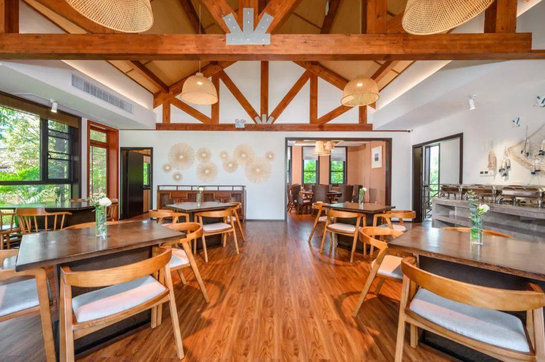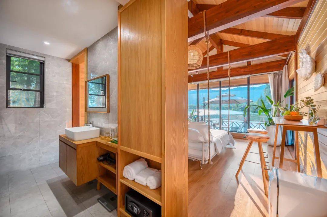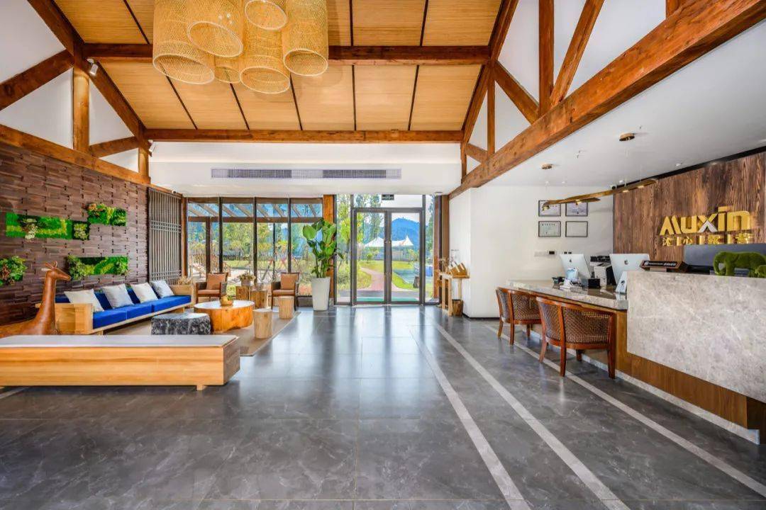 走进敞亮的前台大厅,暖色调的木质家具自然质朴,和大自然的距离又近了一步。