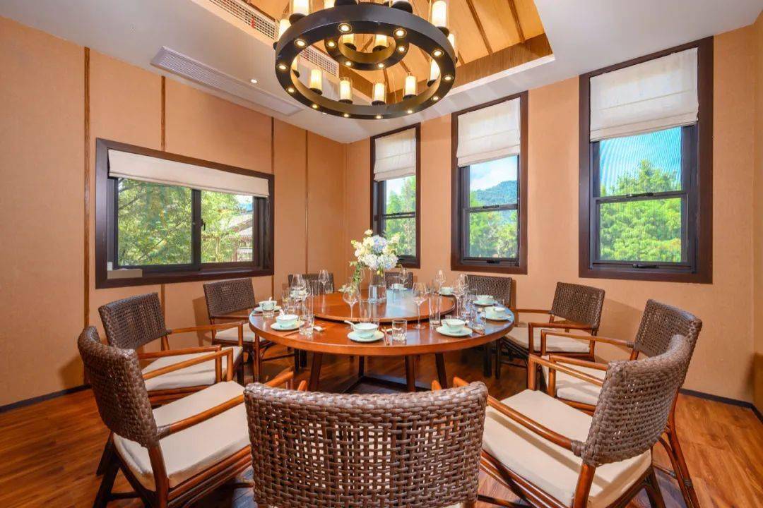 全透明的造型,山水景色360度将你温柔包围,吃饭也成了美的享受。梦幻灯串跳跃在湖中和杉木上,是美好生活的音符在歌唱。