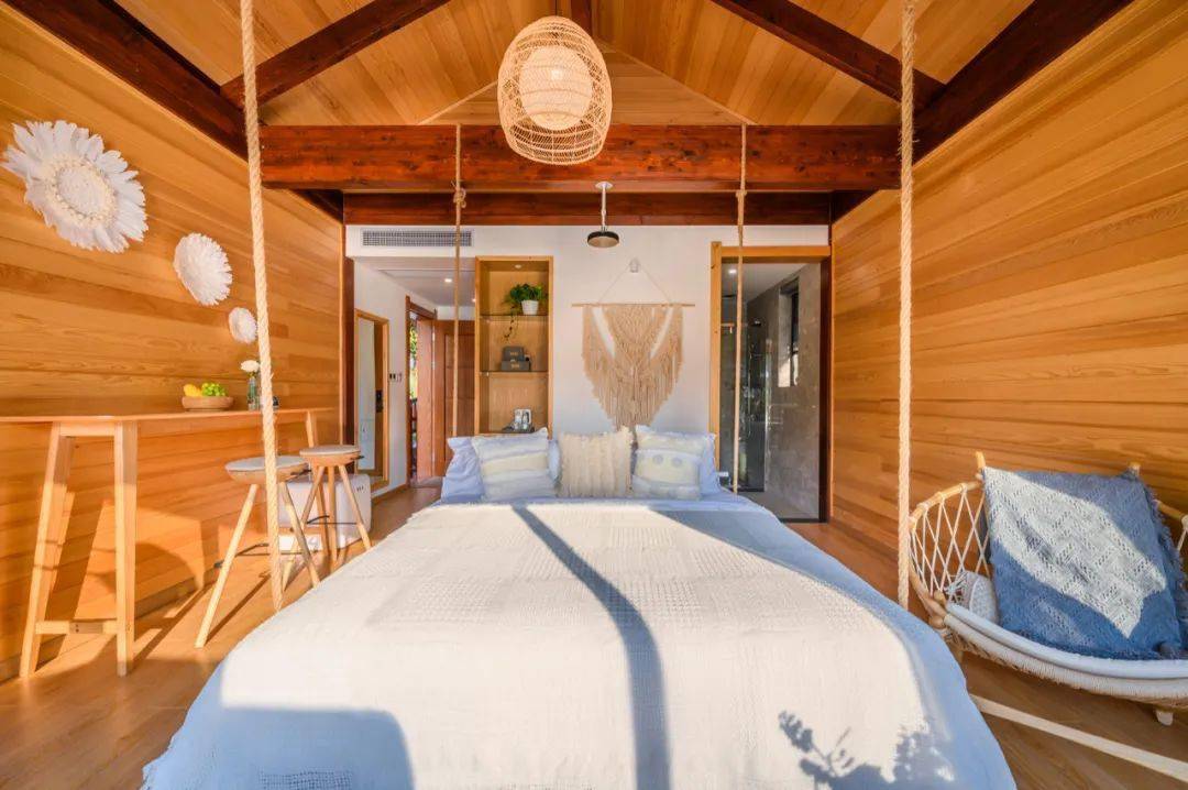 「湖景秋千房」直面开阔的湘湖,秋千床更像是一场精心编织的浪漫梦境。夜色渐深时,躺入其中,仿佛全身心都漂浮在湖中,不自觉便安然入睡。