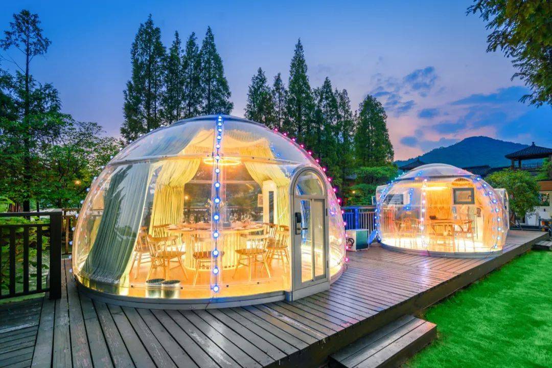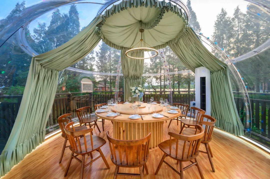 沿着湖边的露台摆放了2处星空泡泡房,是独立的餐饮包厢。