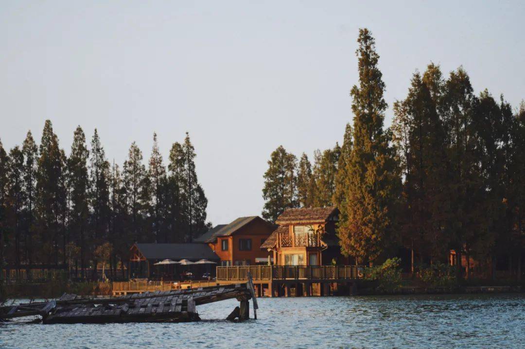 从杉木小道进入, 5幢木屋依次架于湘湖之心。一阵风吹来,他们好似停靠在原始森林湖畔中的船只,也随着碧波微微荡漾起来。
