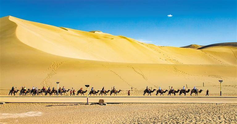 ④甘肃敦煌市鸣沙山月牙泉旅游景区迎来旅游旺季。