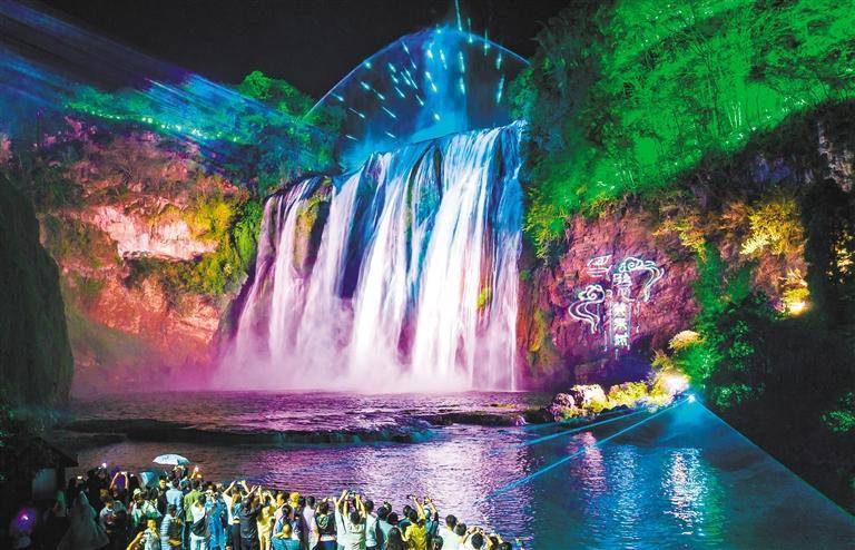 ③游客在贵州安顺市黄果树瀑布景区观赏夜景。景区结合多种科技呈现手段,为游客带来沉浸式光影体验。陈 熙摄(中经视觉)