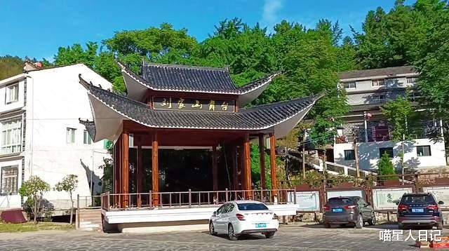 继续往前走,就到了村里的广场,那里有一个大场景,有一个牌子。近年来,全国很多村庄或大村都建起了类似的戏台,有的是现代风格的建筑,有的是古色古香的老建筑。刘家山村的戏台面积较大,具有古典的设计元素,建筑也很有特色,尤其是建筑依山而林,给人一种幽深深邃的感觉。站在舞台上,俯瞰的山林景观近在咫尺,形成立体布局,层次感突出。例如,近处的水平面以村庄为主,而远的水平面则郁郁葱葱。看那一片混沌,雾气弥漫,山林空旷,总有一种仙境的感觉。