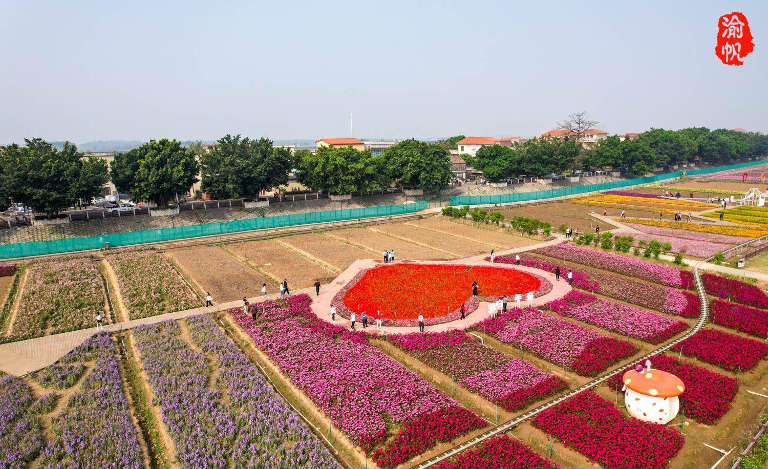 早上的第一站,我们来到了佛山市三水区白坭镇沙尾村的七彩花田。从无人机视角,高空俯瞰,大致可以看到帝王菊、菊花、向日葵、赤壁花、鸡冠花、百日草等品种。