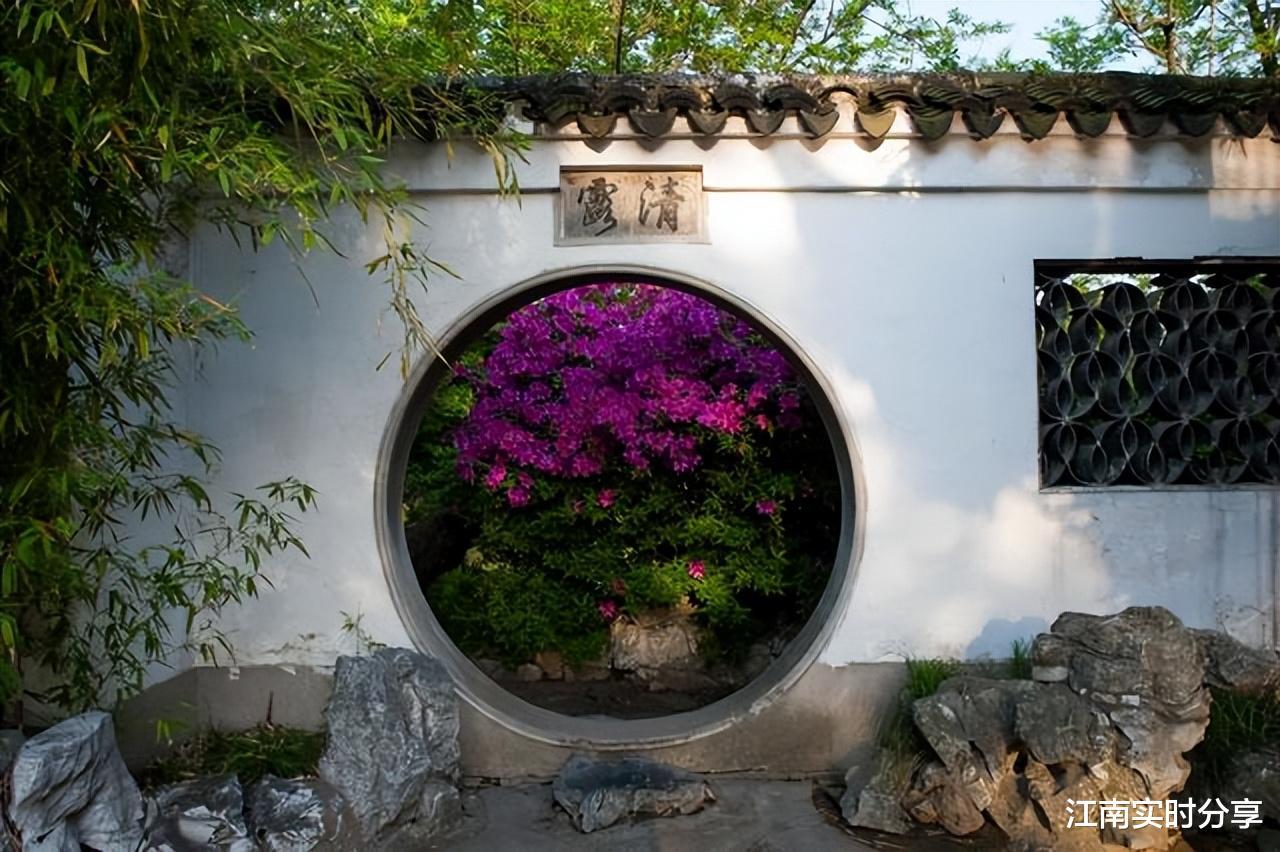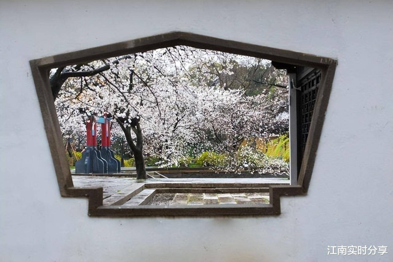 涵万轩有两扇门,都是花瓶形状,谐音“平”,象征平安;江雪轩则有最经典的月洞门、花墙、水磨青砖砌成的六角漏窗。。Ji是一种美丽的构图材料,它捕捉了风吹过的窗户里的樱花。