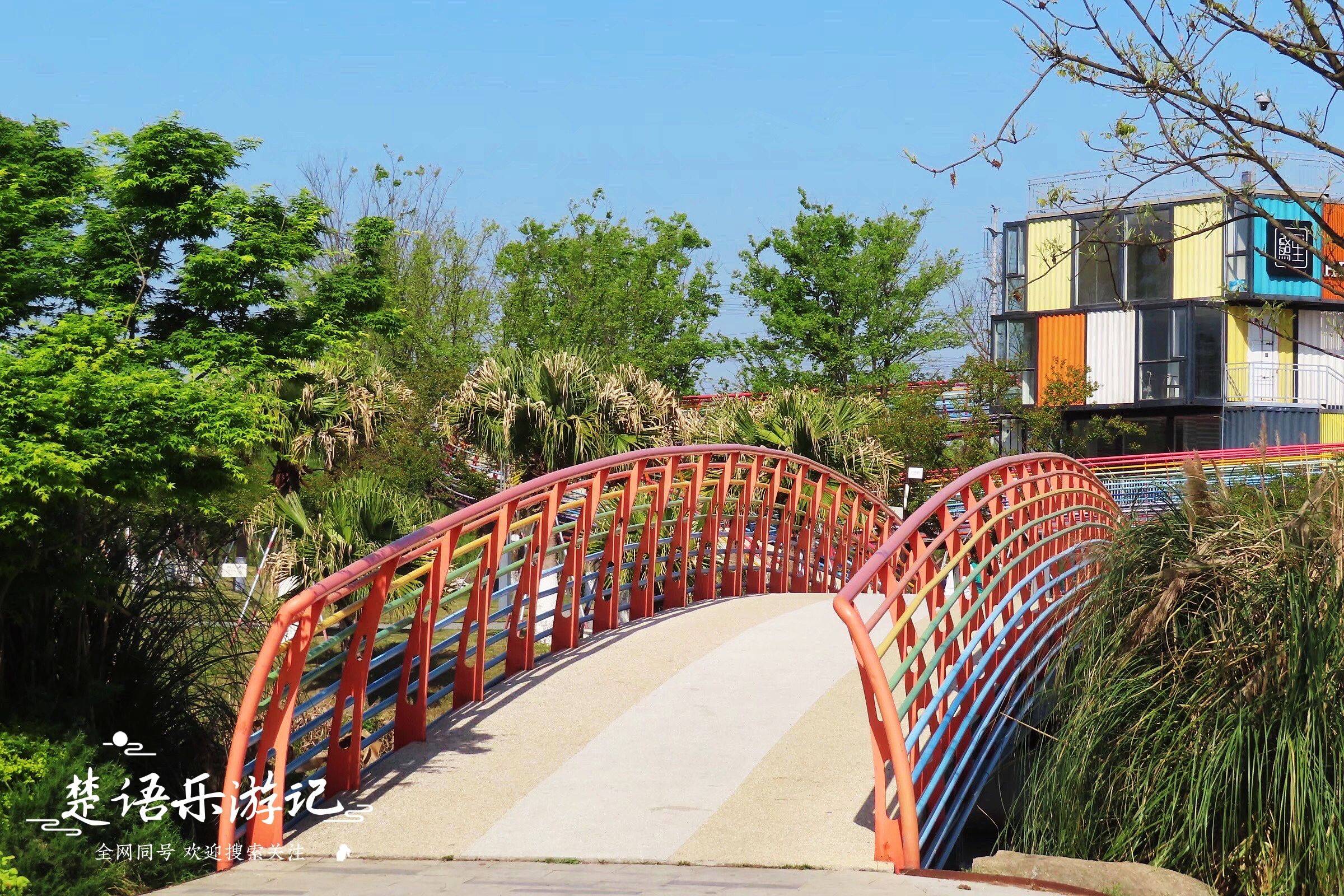 拱月桥是红塘湾的正门,桥南是河马广场,桥北是月亮郡主题商业街,左转前行可到达仙女草坪和月亮岛,过桥右转可到达铁轨花园。河边有铁轨花园,里面有樱花,樱花树下有两条斑驳的铁轨。我来这里玩的时候,碰巧遇到一个带着四个孩子从铁路线那头走来的年轻人。晨光打在他们身上,在地上投射出五个明亮的影子,就像一幅画。