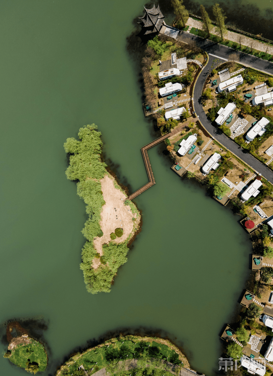 小岛静静漂浮在湘湖之上,两排高大的水杉将其分为东西两个区域,一边是 露营草坪和 湖上木屋群,另一边则是 房车营地。