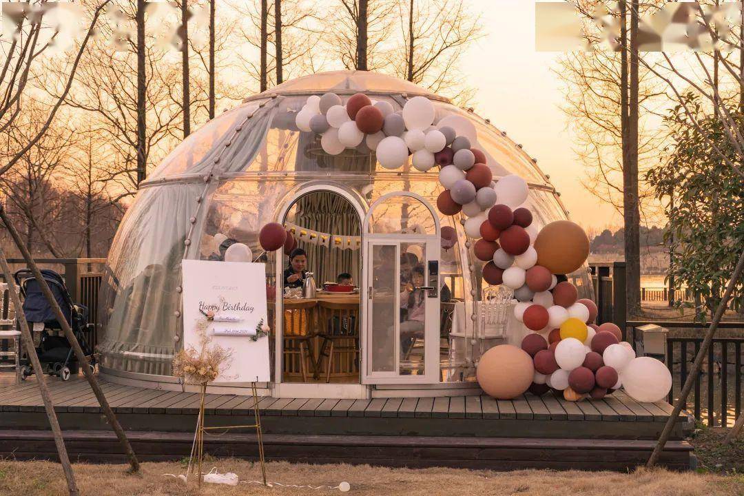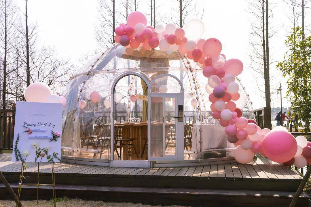 另一处的 星空泡泡房也是打卡热门地,全透明的造型,山水美景360°将你温柔包围,在这里举办一场生日派对简直超梦幻。