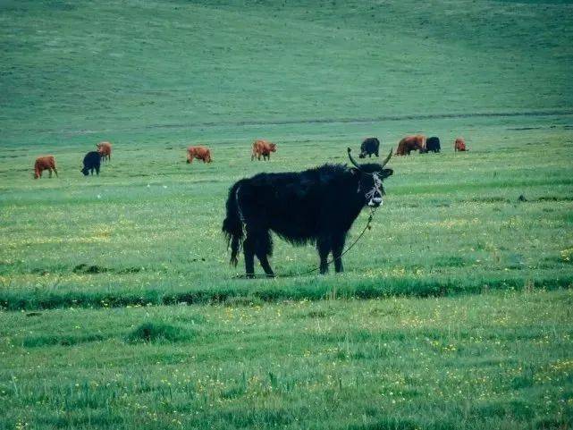 白天,牛羊沿着公路在草原上悠闲散步,偶尔一两句哞声吆喝着,风吹过草原,让人顿生放飞心情、回归自然的一股冲动。