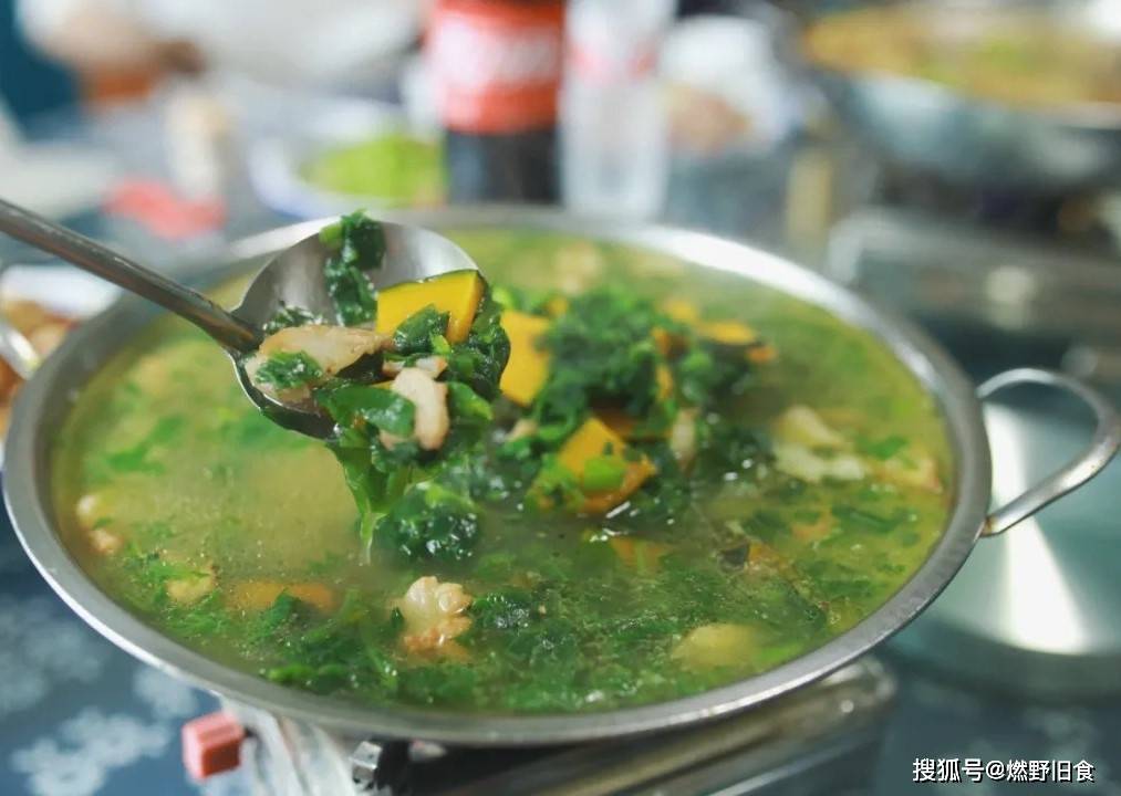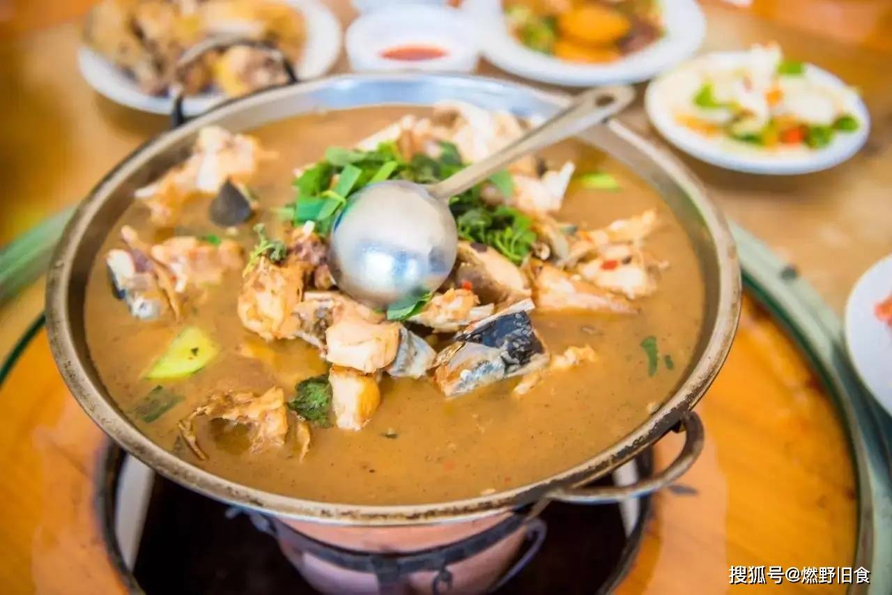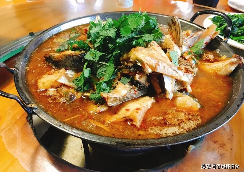 食材选用当地乌溪江里的生态鲢鱼,将鱼头煎至外焦里嫩,然后放入农家豆腐和黄瓜,用薄荷叶覆盖,用炭炉加热,汤又辣又鲜,甜得让人流口水。